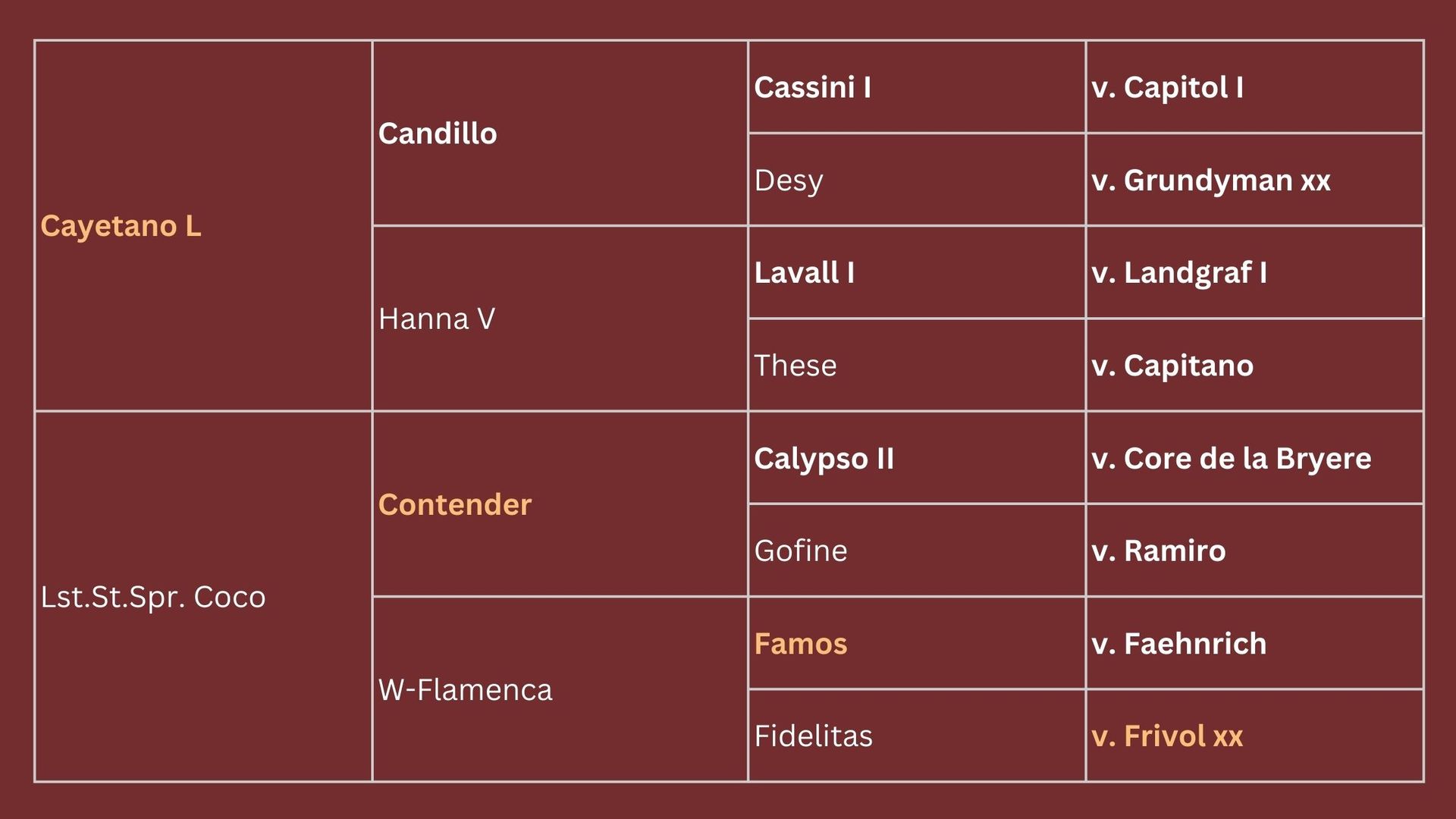 Muttervater Contender zählt seit Jahren zu den weltbesten Springpferdevererbern. Aus der Großmutter W-Flamenca stammen die Stuten Empire II, Mutter von drei erfolgreichen S-Springpferden, und Gräfin VI (beide von Silvester), Mutter eines S-Springpferdes. In dritter und vierter Generation folgen Famos und Frivol xx als Leistungsgaranten. Die Urgroßmutter Fidelitas H brachte mit Capitol I das S-Springpferd Corrado sowie die beiden M-Springpferde Carissimo und Careca. Aus enger Verwandtschaft kommen noch die gekörten Hengste Louisville (v. Loutano) und Conclido (v. Concetto I) sowie weitere Sportpferde.